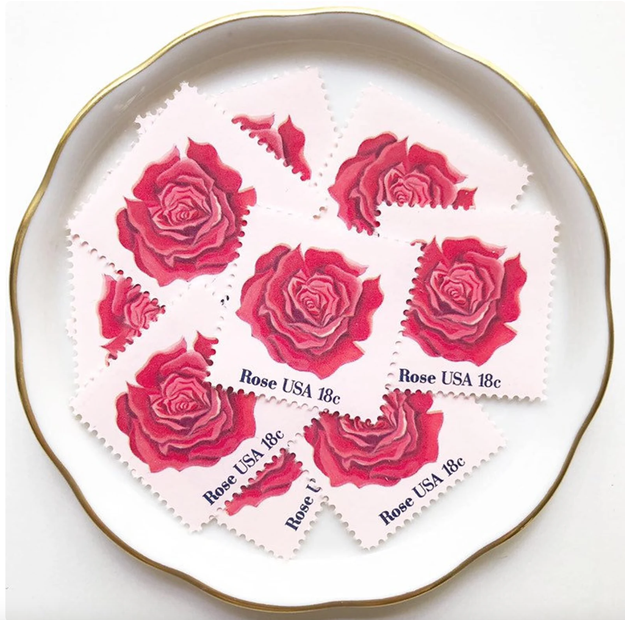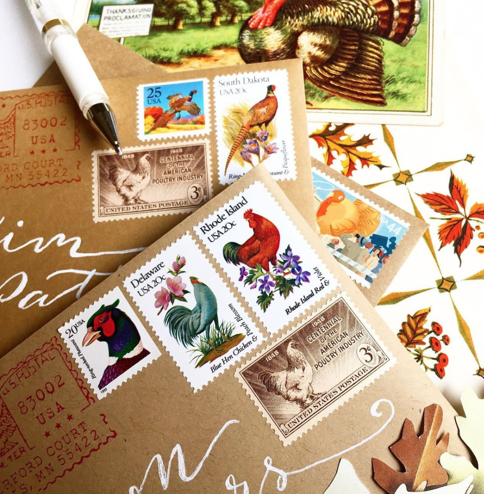 You can, of course, order modern sheets from USPS to decorate your envelopes (and remember, a Forever stamp is good forever! When the price changes, its value changes, too). But you don’t have to stop there! There are plenty of online vendors who sell vintage and modern postage, categorized either by design or in grab-bag fashion so you get a good mix of colors, stamp values, shapes, and sizes, all of which add plenty of visual interest to your envelope art!